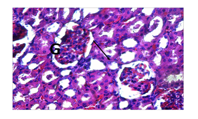 The animals were weighed before and after administering the crude extract in order of 200mg/kg, 400mg/kg, 600mg/kg, and 800mg/kg body weight with regards to the LD50 of 4525mg/kg body weight, using oral administration for 28days. On day 29, all animals were sacrificed by cervical dislocation; the Kidney, Liver and Small intestine was excised and preserved in 10% Neutral Buffered Formalin and transported to the Laboratory for tissue processing using the automatic tissue processor. Average weight of rats=172.6g. Each rat in group A,B,C,D and E (n=5) were picked one at a time with a hand towel and a dose of 200,400,600 and 800mg/kg body weight (b.w) respectively were administered orally using a sterile 5ml syringe. Nonetheless, group A served as the control. Each animal was weighed before and after administering the test extract. The experiment lasted for 28days, oral treatment were given daily while on day 29; all animals were sacrificed by cranial-spinal dislocation. The kidney, liver and small intestine of the animals (treated and untreated groups) were excised and examined grossly. After that it was processed histologically by the automatic tissue processor (Hestion- ATP7000 Tissue processor- Germany). The selected organs such as the kidney liver and small intestine from each group of each animal were fixed in 10% Neutral Buffered Formalin for 48hrs following grossing at 3-5mm in diameter. Subsequently, they were dehydrated in graded concentration of ethanol (ascending grades), cleared in xylene and embedded in paraffin wax for sectioning. After that, sections of about 3-5mm in thickness were obtained using the Hertz rotary Microtome (Leica RM2255, Cambridge Mode) and mounted on glass slides. Staining of the section was according to Haematoxylin and Eosin (H & E) technique and Periodic Acid Schiff (PAF) technique and was examined using Swift® binocular microscope with an inbuilt lightening system (Olympus, England).14