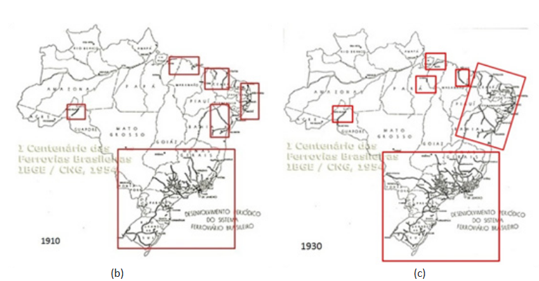The function was to allow the railway transport in parallel with Madeira River, which prevented the continuity of navigation, used to drain the latex rubber, produced in northern Bolivia. The route of the railway with 344km of line was completed in 1912, linking the cities “Porto Velho” to “Guajará-Mirim” (state of Rondônia), completely paralyzed in 2000 and classified in 2006 as Brazilian Cultural Patrimony.6 Another highlight is the construction of the “North West railway of Brazil”, started on 1905, for the use of “Porto Esperança” in 1914. Starting from the city of Bauru (state of São Paulo), this railroad crossed the state of São Paulo and the current state of Mato Grosso do Sul reaching up to city of Corumbá. This line became known as “Pantanal” train. In 1930, highlighting the branches in the Southeast, first branches in central - west region and an increase in extensions in the northeastern states.7 Figure 3(C) shows the railway net work in 1930.