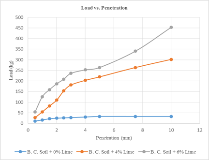CBR test results: The CBR of a soil is an indefinable symbol of its strength, which for a given soil, is dependent upon the conditions of the materials at the time of testing. This means that the soil needs to be tested in a condition that is critical to its design. At any given moisture content, the CBR of a soil will increase if its dry density is increased, i.e., if the air content of the soil is decreased.15–17 Thus, a design dry density should be selected which corresponds to the minimum state of compaction expected in the field at the time of construction. The unsoaked CBR value for the clay soil was found to be 4.8%, which is a poor rated sub grade. Extra of 6% lime increased the unsoaked CBR value to 45%, while 4% lime reduced CBR to 25% which is rated a relatively poor sub grade (Figure 6). As it is clear in Figure 6, the graph it shows that the load increases as the content of lime is increased hence an increase in CBR value.