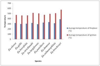 Figure 2 Ignition and the hearth temperatures of some species of Eucalyptus of Arboretum Hajeb Laayoun.
