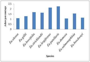 Ash is formed from mineral matter during combustion and gasification. The ash yield of wood grown in the temperate zones is 0.1-1.0%, whereas wood grown in the tropics contains up to5% ash.15 The bark contains 3-8%, ash. Wood ash typically includes 40-70% calcium oxide and 10-30% potassium oxide.16 The mineral content of wood and bark is highly variable between and within species and can vary with soil and growth rate.17 Figure 3 illustrates the percentage of ash resulting from combustion. Indeed, this percentage of ash is ranged from a maximum observed at Eucalyptus patellaris (2.25%) and a minimum determined at Eucalyptus demise (1.05%). This inter-species variation of Ash content could be explained by the fact of hardwoods species (Eucalyptus) have a complex anatomical structure which is better able to keep a lot of mineral compounds during its growing than softwood species.