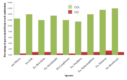 For the gas exhaust Figure 4 shows that the complete combustion of the wood of different species exhausts almost similar CO and CO2 percentantages. The CO2 exhausted was maximum or Eu. dumosa (15.5%) and Eu. Patellosa (11.5%) while the values of the CO exhausted were almost the same.