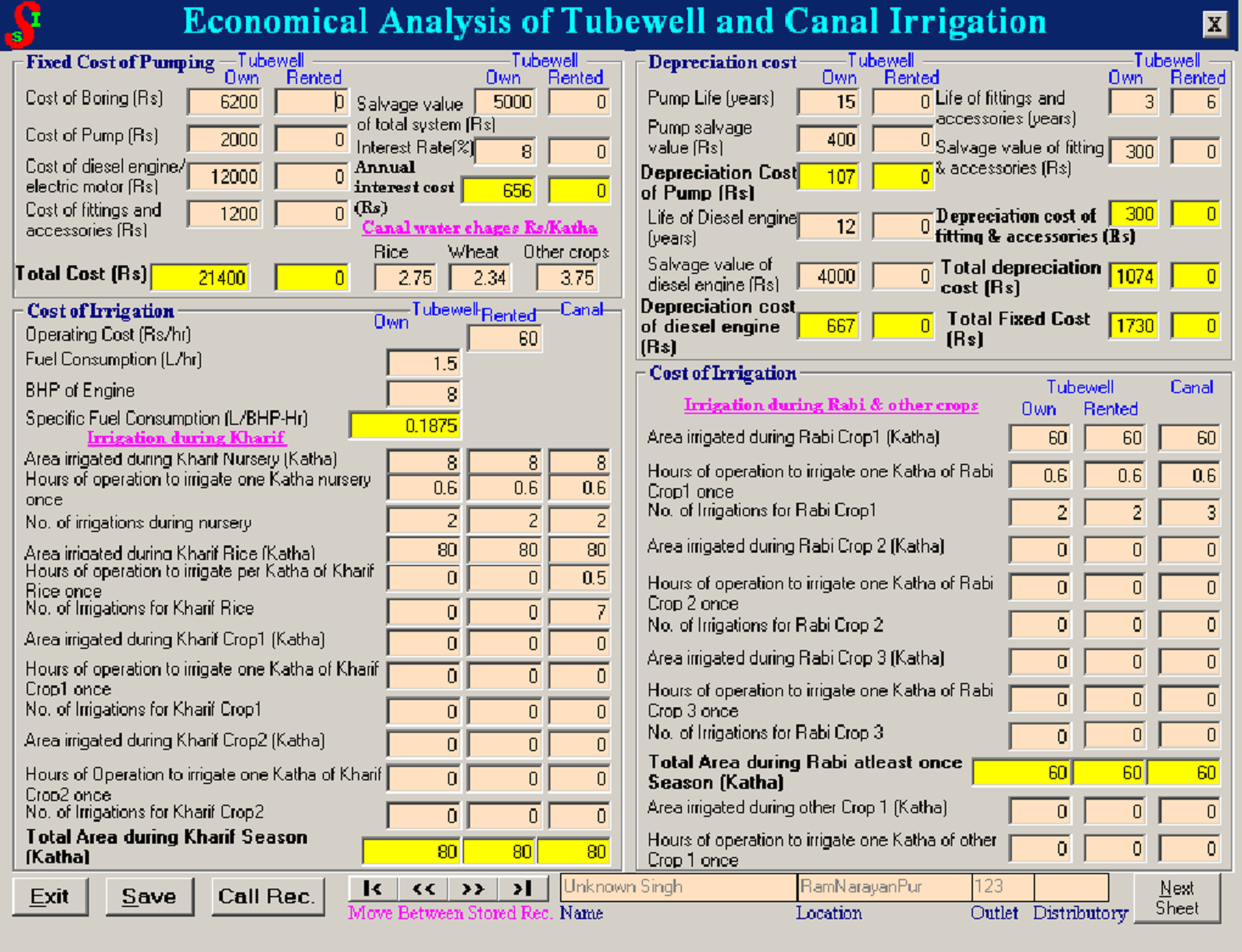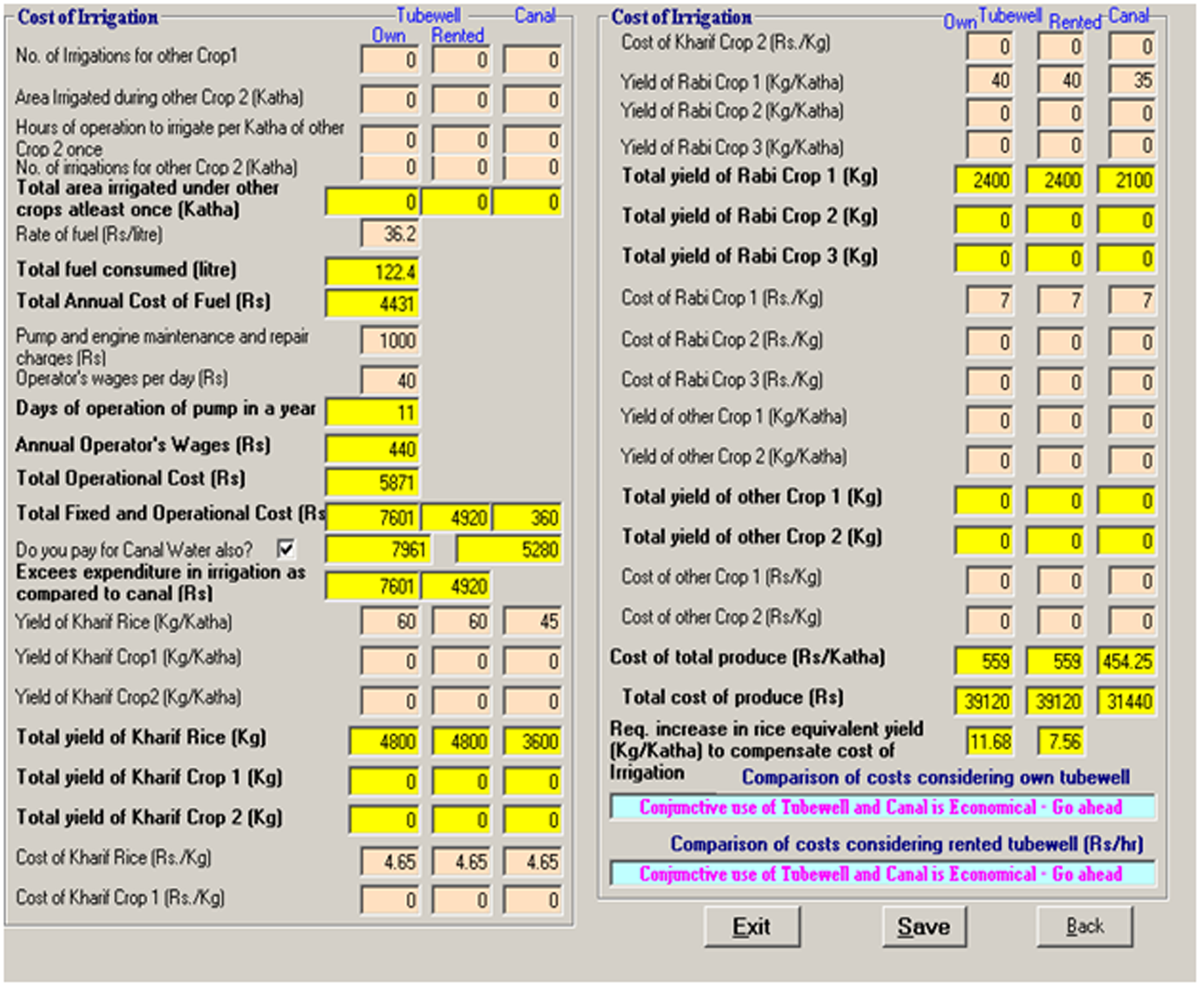 In order to convince the farmers about concept of conjunctive use and its’ economical benefits, a decision support tool is developed in English using Visual Basic platform. This interactive tool calculates (i) annual fixed and operational costs of irrigation from tube well and canal, (ii) yield and total cost of produce, (iii) excess expenditure incurred in tube well irrigation over and above the canal water charges, and (iv) required yield increase needed to compensate for the additional cost of irrigation from tube well.