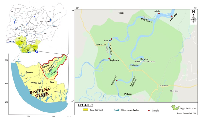 The Niger River and Benue River forms a confluence at Lokoja and then flows Southwards into the vast Niger Delta covering approximately 30,000Km2. The River Niger bifurcates at Asamabiri into River Nun and River Forcados, which progressively spilt into several distributaries with no fewer than 30 outlets including estuaries into the Nigeria gulf of Guinue. A total of 250 Km3/yr of water discharges into the gulf of Guinea. Rainfall in the Niger Delta is typically 2700mm – 3000mm/year, while actual evaporation is about 1000mm/year.3 Table 1 shows the cross-sectional details of the rivers at the study stations while Figure 1 shows the study map.