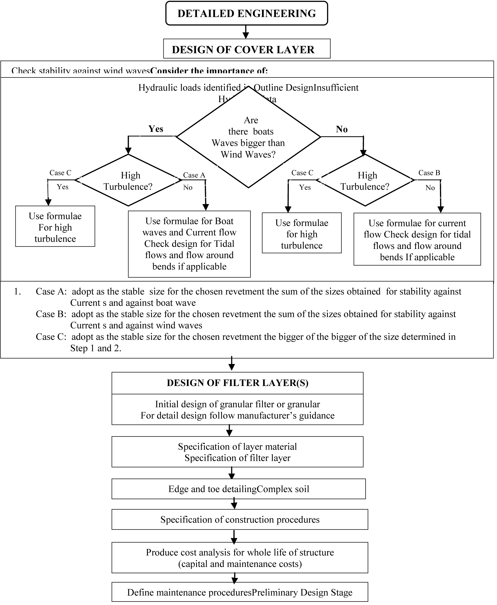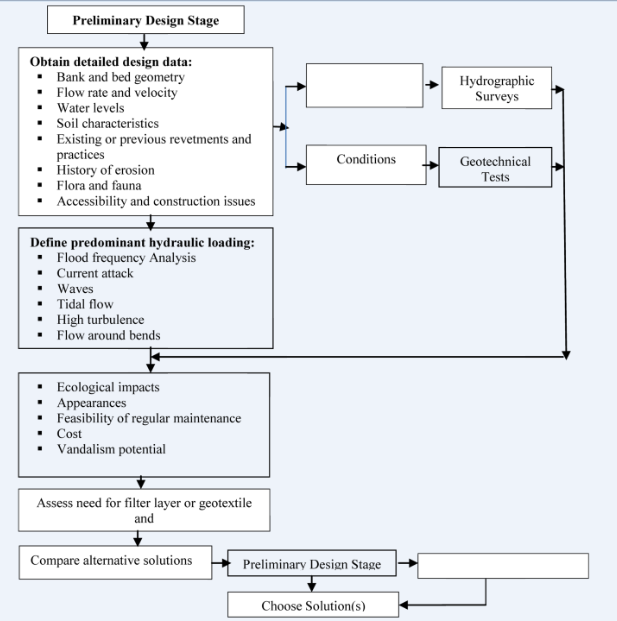 The better performing schemed of Otuokpoti and Sagbama were designed using the Pilarczyk’s equation9 which failed 30 years after completion and also survived the 2012 centinary flood with a discharge of about 30,000m3/sec. Pilarczyk’s equation have been recommended for design of riprap, cabled concrete block, box gabions and asphalt mattresses while Hemphill & Bramley,10 is recommended for riprap, loose or interlocking concrete blocks and gabion mattresses.8 In view of the poor designs, failed installations with concomitant financial wastage characterizing the development of the shore protection works in the Lower Niger River Basin. The flowcharts for both preliminary and detailed design respectively adopted from Escarameia8 are presented to guide prospective designers. Figures 2 &3 shows typical flowchart for preliminary and final design stages respectively.