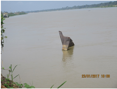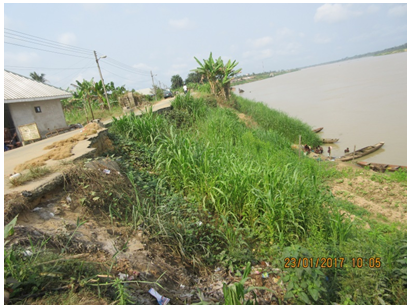 Other factors such as flexibility and permeability are related to the ability of the revetment structure to transfer pressure forces to and fro the river bank. Considering columns 8 and 10 in Table 1), that the banks are very steep and slopes greater than 34o degrees with moderate to very heavy hydraulic loading and low permeabilities. Consequently, the sheet-pile revetment option adopted for Opokuma/Kolokuma shore protection is in-appropriate. Sheet-piles are available in standard length of 39ft (≈13m), given the existing bank heights, they were not driven to the required embedment depth. The result was failure and collapse under flood conditions (Plate 1−3). Furthermore, sheet-piles offer restricted access to the foreshore and have adverse effect on the community lifestyle.