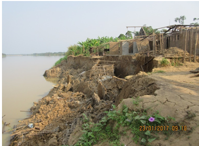 High pour water pressure with high hydrostatic pressure gradient during flood recession. Reduce effective stresses in the bank trigger deep-seated rotational failure (plates 1 and 2). Also increased unit weight caused by infiltrating water into the banks |