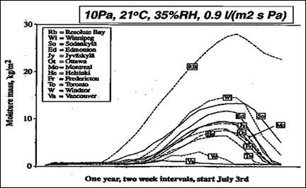 Figure 2 Effect of climate on moisture condensed during the exfiltration of air (under conditions shown) for different climates by Moisture Manual.12