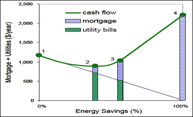 Figure 3 Costs of utilities (green) and mortgage (blue) versus energy savings from zero savings to 100% savings. Point 1 is the starting point, point 2 the energy conservation measures alone, and point 3 the beginning of PV contribution from Wright & Klingenberg.13