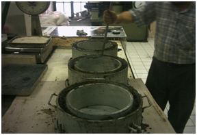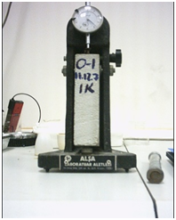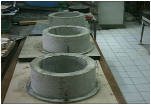 The mixture ratio of mortar is determined by investigating the other studies and is chosen as 1:4:0,5 which is the ratio of the weights of the cement, the fine aggregate (sand) and water relatively. The mixture ratio of concrete is the same as 1:4:0,5 which is the ratio of the weights of the cement, the fine and coarse aggregate (sand, pebble) and water relatively. The water/cement ratio of the mortar and concrete is constant as 0.5. In Table 2, the amount of materials in 1m3 mortars and concrete is revealed. In the production of concrete and mortar, the aggregates are mixed with the half of the water for one minute and then the cement is added and they are mixed for one minute. After 1 minute, the rest of the water is added and mixed for 4 min. For the restrained shrinkage tests, the inner and outer diameters of ring samples are 270mm and 300mm consecutively Figure 1. Fresh mixture is settled to the 30cm width and 120cm height ring molds by pricking, and after the settlement, the molds are vibrated for one minute in Figure 2. For the free shrinkage, three prisms with 4x4x16cm dimension are produced. Another three prisms with 4x4x16 cm size are produced to measure the mechanical properties. According to AASHTO PP34-98, the ring specimens are held at 20oC and 40% relative humidity for 24 hours, and then, they are taken out from the molds. The upper parts of the ring specimens are covered with the silicone coatings in order to allow to drying from the outer, circumferential surface. The crack width is observed with the 10X special microscope in Figure 3. The measurements are made every day for 42 days to determine when the crack occurs and the development of the crack width. According to ASTM C157-98, the change in the length of the prisms is measured every day for 42 days to determine the drying (free) shrinkage. Also, the weight loss of the prisms is measured. 4x4x16cm prisms are used to measure the tensile strength on 3, 7, 28 and 42 days. After the prism is settled on the supports, they are loaded with the half of the length the specimens, and the fracture load is recorded. Broken samples in the tensile strength test are used to measure the compressive strength on 3, 7, 28 and 42 days.