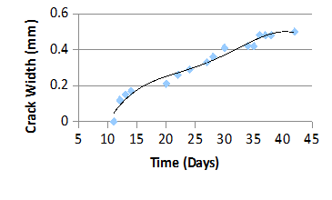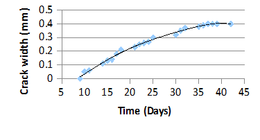 The crack forms at 12 days for the mortar and the first average crack width is measured as 0.12mm in Figure 4. At 42 days, the maximum average crack width is measured as 0.5mm. In Table 3, the change in the crack width of the mortar is shown. In Figure 5, the graphical change is also revealed. The first crack forms in the concrete at 10 days and the first average crack width is measured as 0.05mm. At 42 days, the maximum average crack width is measured as 0.4mm. This situation is revealed in Table 4 & Figure 6. Although the crack forms in both mortar and concrete at an approximately same time, the crack width of the concrete is smaller than the mortar.