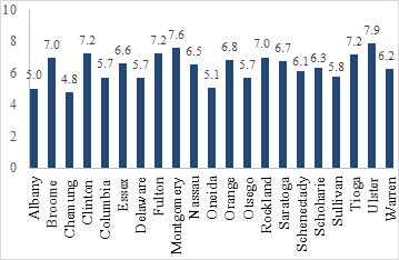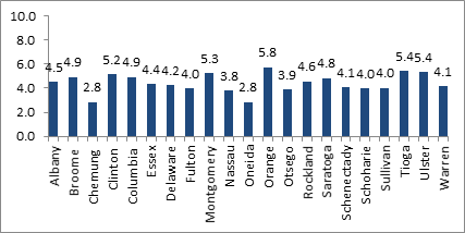 However, a few outliers including Nassau, Broom, Orange and Tioga counties make trusting this trend difficult. To try to improve the result, these four counties were eliminated from the data. The resulting graph, shown in Figure 24, is even further away from the expected outcome than the graph including all counties. Figure 8 & Figure 9