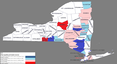 The scores for each principle were normalized on a scale of 0 to 10. Then, the mean score and standard deviation of each principle across all the counties were determined. Figure 2 through 17 illustrate the county-level variation in plan quality across the eight principles. For each principle, each county was placed into one of four quality categories based on its standard deviation from the mean. That is, each county was mapped based on how it ranks in comparison to the average plan. Those plans that scored more than one standard deviation above the mean are considered high quality and colored dark blue. Those plans that scored more than one standard deviation below the mean are considered low quality and colored red. The light blue and pink colored counties are moderate in quality. Those plans with scores less than one standard deviation above the mean are colored light blue, and ranked fairly better than the counties with scores less than one standard deviation below the mean colored pink.