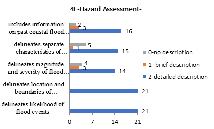 Figure 21 illustrates the Hazard Assessment criterion which includes the likelihood of flood events, location and boundaries of hazardous areas, magnitude and severity of flood hazards and information on past coastal flood events. As Figure 21 shows, all of the HMPs provide detailed descriptions on the boundaries of hazardous areas using geographical information, and the likelihood of flood events by determining the return period and probability of occurrence.