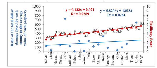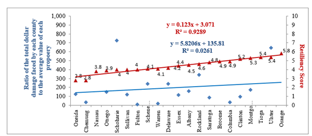 The goal of this analysis was to compare the trends between the damages faced by each county due to Hurricanes Sandy, Irene, and Tropical Storm Lee and their Resiliency Score. To start, the total dollar damage caused by the three storms for each county was approximated. To normalize the damages faced by each county due to differences in property values, it was necessary to determine the ratio of the total dollar damage in each county to the average property value in each county. A high dollar damage value does not necessarily mean the county experienced more damage; high property values could in fact be the reason for the high dollar damage. The average property value in each county was estimated by dividing the aggregate value of all properties in the county by the county population. The results are shown in Figure 23.