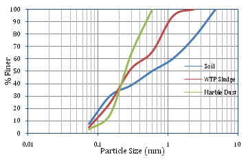 The soil, MD and WTPS were tested for Grain Size Distribution. The tests were performed as per IS: 2720 (Part IV)- 1985.15 Three samples of each material were tested for Sieve Analysis and average of them has been presented in Figure 1. The coefficient of uniformity (Cu) and coefficient of curvature (Cc) have been calculated for these materials (Table 3).