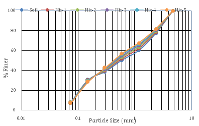 For different mixes, percentage finer were calculated based on the ratios of different constituents in the mixes (Figure 2). For these mixes, coefficients of uniformity and curvature (Cu, Cc) have also been evaluated and are presented in Table 3.