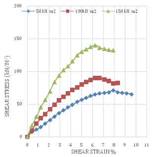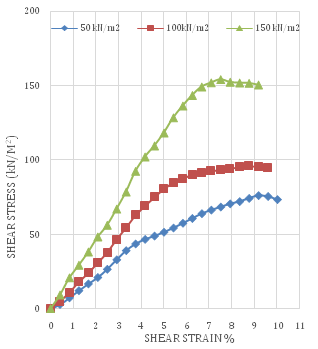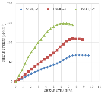 The shear parameters of soil and its different mixes were determined by using Direct Shear Test as per IS: 2720 (Part XIII)-1986.17 For this test, the samples were prepared at their corresponding MDD and OMC. The specimens were of size 60mm×60mm×25mm and sheared at a rate of 1.25 mm/minute. The stress-strain relationship for the soil and all the mixes is depicted in the Figures 3-8. The shear strength parameters i.e. cohesion (c) and angle of internal friction (ø) of the samples were determined and mentioned in Table 4.