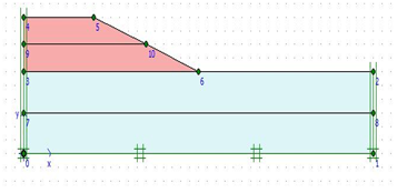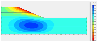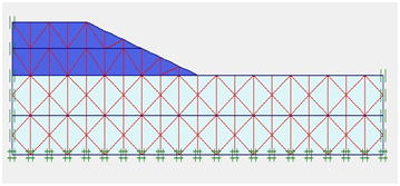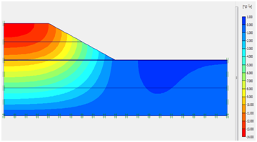 A finite element based software PLAXIS 2D was used to calculate the displacements and stresses in different embankments made up of the soil and these mixes. Mohr Coulomb model was selected for the embankment fill materials. The material properties used in the model for different mixes are obtained from the experimental program and listed in Table 4. A road embankment 16m wide and 4m high is analysed by PLAXIS (Figure 9). The sides have a slope of 1:3. The embankment is considered to be made up of different mixes. The sub soil consists of 6.0 m thick layer of locally available soil. The numerical model has been analysed with 2D plane strain model considering only half of the section due to its symmetry. A total width of 40 m has been used which starts. Typical contour diagrams for horizontal and vertical displacements for embankment with properties of locally available soil obtained from the numerical analysis are presented in the Figure 10 & 11 respectively. The results obtained after analysis shows that maximum settlement occur after full dissipation of pore pressure. The same analysis was carried out for the embankments made up of different mixes and maximum horizontal and vertical displacements were recorded and plotted Figure 12 & 13.