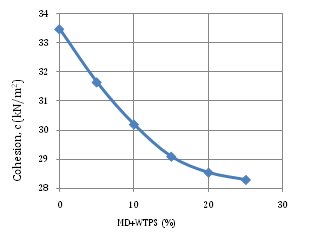 The shear strength parameters for the soil and for all the mixes have been plotted in Figures 14-16. It is observed that the angle of internal friction increases with percent of MD+WTPS upto 20% then decreases. Whereas, the cohesion decreases and the rate of decrement also decreases thus a constant value at large percentage of MD+WTPS.