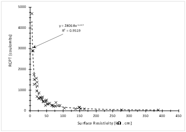 Laboratory tests to evaluate concrete resistance to chloride ion penetration are length and not economic. Surface electrical resistivity correlates well with a wide range of RCPT values Surface resistivity can be used as a quick, economical and efficient NDT to evaluate concrete durability with respect to chloride ion penetration. Surface resistivity test can be easily used to improve quality control of concrete during construction to meet required performance–based criteria. The surface resistivity test can be used as a tool to provide sufficient controlled durability and performance–based specifications.