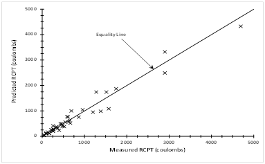 Figure 2 shows the relation between surface resistivity and RCPT results. The relationship between both results showed very good correlation with the R2 value of 0.952. Figure 3 shows the very good relationship between the measured RCPT results and predicted RCPT values. The relationships show that surface resistivity can accurately predict the concrete’s resistance to chloride ion penetration. Also, the prediction can be used for a wide range of concrete quality. According to the developed relationship, Table 3 shows the correlation between surface resistivity and chloride ion penetrability classification. Therefore, surface resistivity test can be used as a quick, not costly and efficient method to evaluate concrete durability regarding chloride ion penetration and corrosion resistance.