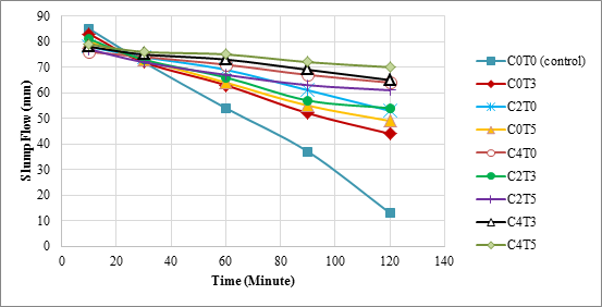In this experimental program, rheological properties of nanoparticles were measured by the slump flow test. The slump flow measurements of all mixtures were in the range of 73-86 mm. The effects of TiO2 and CNF on the flowability of mixtures are associated with the content of nanoparticles, as indicated in Figure 2. The slump flow test is a critical parameter to evaluate flow ability of concrete mixtures. The nanoparticles are shown to have several effects on the workability of concrete. As it indicated in Figure 2, the TiO2 and CNF might lubricate solid particles of the cementitious materials and sand, which increases slump flow through the time. The lubrication effect is dominant after 30 minutes of the mixing process. Meanwhile, the nanoparticles captivate water and decrease flow ability. Another impact of using TiO2 and CNF is keeping the rate of slump flow steady. Incorporating these nanomaterials generally made the concretes less viscous. The flowability characteristics of mixtures did not change significantly. Since applying CNF and TiO2 might improve the consistency of concrete mixtures. Less bleeding and segregation were also found in the concrete mixtures containing both CNF and TiO2.