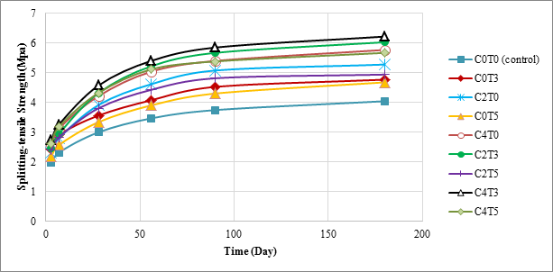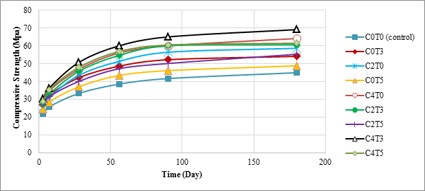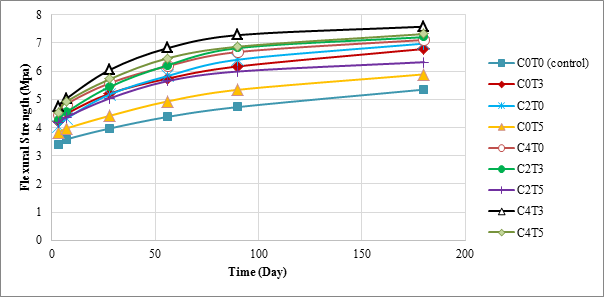 The compressive, splitting-tensile and flexural strength of specimens up to 180 days are shown in Figures (3–5). It can be seen that the strength is developed in concretes containing nanoparticles in every mixture higher than that of control specimen. As it is shown in Figure 3, the compressive strength of concrete was meaningfully improved by using TiO2 as a cementitious materials replacement. The 28-day compressive strength of concrete was heightened as much as 26.5% and 11.3% in comparison to that of the control specimen by replacing 3 and 5 wt% cement with TiO2, respectively. The compressive strength increased from 26.5% to 52.4% when the 0.4 wt% CNF was added to the mixture. The growth in the compressive strength of concrete with nanoparticles compares to control concrete might be attributed to the pozzolanic reaction of TiO2 and CNF. These kinds of reactions which are very effective based on pozzolanic performance, may lead to the development of the C-S-H gel.