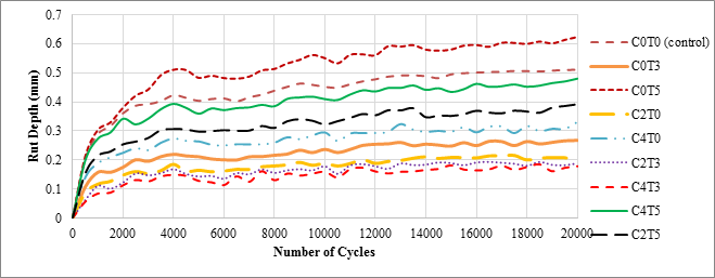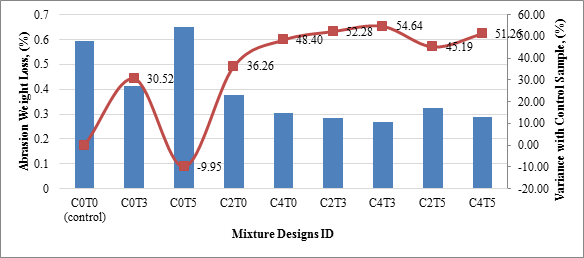 Abrasion test: Since the abrasion resistance of the cement paste is very slight compared to the aggregates, in this project it is aimed to explore the effect of TiO2 and CNF on the increment of wear resistance of concrete. Meanwhile, as TiO2 had no impact on the increment of wear resistance of concrete, rigid cement paste samples were used instead of concrete samples.30 In this way, direct effects of nano TiO2 and CNF on the abrasion resistance of cement paste were measured. One of the available test methods to this end is an accelerated loading test and rotary abrasion. The Hamburg-Wheel-Track (HWT), which employs a scaled dynamic wheel passing back and forth over the specimen, might simulate loading and wear of the applied coating. The mechanism of wear-out of the frictional resistance is at the heart of erosion analysis where such wear-out is a function of traffic, wet days and the shear strength of the sub base layer. A sliding and shearing type movement under the action of a rolling tire causes a load-induced shear stress τ that exceeds the effective shear strength of TiO2 and CNF causing wear to take place. Testing will be conducted at room temperature under dry conditions, during which progress of surface rutting is monitored. A maximum acceptable rut depth of 6 mm at 20,000 passes is used in the specifications. Another approach for testing abrasion resistance is using a linear variable differential transformer (LVDT) to measure the depth into concrete surface created by a rotating diamond-core barrel attached to a drill press. The concrete surface abrasion resistance test is based on ASTM C944.31 This test determines abrasion resistance of the surface concrete by measuring the weight loss of the concrete scratched by a rotating cutter in a given period. The cutter consists of a series of dressing wheels mounted on a rod that is attached to a drill press. Abrasion resistance tests were conducted on specimens cured under the same conditions. Surface abrasion resistance test for this research is performed on the surface of a 12-in diameter concrete cylinder. A drill press is used to apply a constant force through the cutter into the surface of specimens and to rotate the cutter at 200 revolutions per minute. In the research, a constant load of 22 lbs was applied on the drill press, and each test was performed for 10 minutes. A concrete specimen was measured before and at the end of an abrasion resistance test to determine the weight loss through the abrasion process.