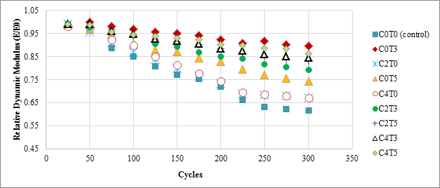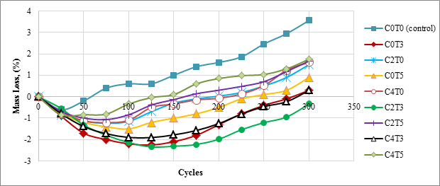 Freeze and thaw: The resistance to freezing/thawing of TiO2 and CNF samples was evaluated in accordance with ASTM C 666,32 in which specimens were subjected to repeated freezing and thawing cycles. Specimens were used to measure the fundamental transverse frequency by using the force resonance method. Samples with dimensions of 100 × 100 × 400 mm were cured under standard conditions and tested for integrity by recording the relative dynamic modulus of elasticity (Eq. 1) every 25 cycles up to 300 cycles.