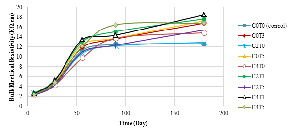 The bulk electrical resistivity of concrete is a crucial factor that specifies the permeability of concrete to harmful agents. It has a significant correlation with the concrete microstructure, pore structure, and conductive ions. The bulk electrical resistivity results for mixtures are shown in Figure 10. The values of all the samples were increased with the aging, principally in the initial days. This high rate increasing is attributed to hydration and hardening. The porosity of mixtures reduced gradually and the electrical resistivity growth decreased. It should be noted that the samples used in this evaluation were cured by keeping the samples in lime saturated water between test measurements. The results further show that for mixtures with nanoparticles, concrete resistivity was changed. The concrete mixtures with higher resistivities corresponding to using TiO2 and CNF at the same time (at fixed w/c ratios). The bulk electrical resistivities of C4T3 and C2T3 were 45.8% and 39.3% higher than the control sample at the ages of 180 days, respectively. In accordance with Figure 10, the porosity of concrete relatively decreased with the incorporating nanoparticles at the same water-binder ratio. It was also observed that concretes produced with TiO2 had a lower bulk electrical resistivity to those of having CNF. According to the obtained results of the water absorption in Table 4, the high values of CNF mixtures were expected due to the much lower water absorption capacity in comparison to control sample.