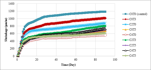 The outcomes of shrinkage test are presented in Figure 11. It was observed that there was a direct relationship between the values of free shrinkage and amount of nanoparticles in the concrete. It can be pointed out that samples had high shrinkage at first initial hours and this rate decreased slightly by time. The reduction shrinkage in nanoparticles is accredited to microstructure. When excess water begins to evaporate from the concrete’s surface after setting, an air/water interface is set up within the capillary pores of the paste. Due to high surface tension, stress induced on the internal walls of the slight pores. This stress is an inward pulling force that inclines to close up the pore structures and decrease the volume of the capillaries. As much as these capillary pores are high, concrete has much potential to shrink. Therefore, using nanoparticles is the main reason for decreasing capillary void content and surface tension effects and consequently reducing the shrinkage as water evaporates from within the concrete. As expected, control sample had the highest shrinkage among other mixtures. The performance of CNF in controlling shrinkage was better than TiO2. However, the largest shrinkage values were recorded for the mixture that contains CNF at first hours. The reason is attributed to free shrinkage which occurred between 4 and 6 hours. The shrinkage began long before the occurrence of the phenomena that determine a change in the pseudo-rigid structure of the mixture. This shrinkage decreased gradually. In C4T0, 47% reduction was observed in shrinkage at 90 days. The nanoparticles addition in the mixture results in lower shrinkage values.