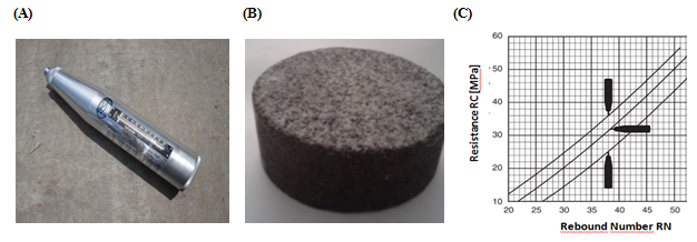 The Schmidt rebound hammer is principally a surface hardness tester. It works on the principle that the rebound of an elastic mass depends on the hardness of the surface against which the mass impinges (Figure 2). There is little apparent theoretical relationship between the strength of concrete and the rebound number RN of the hammer. This test was performed on the specimens according to standards EN 12504–211 and EN 12309–3.12 Schmidt rebound hammer test gave values of RN. The compressive strength of the concrete was derived using the chart provided with the device.13 No action has been located within 40 mm of the flat faces of the specimen. The hammer has to be used against a smooth surface, preferably a formed one. Open textured concrete cannot therefore be tested. If the surface is rough, e.g. a trowelled surface, it should be rubbed smooth with a carborundum stone. RN was equal to the median of 9 measures spread.