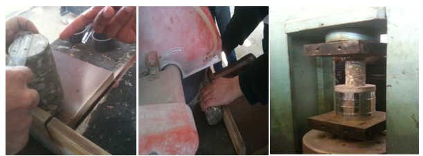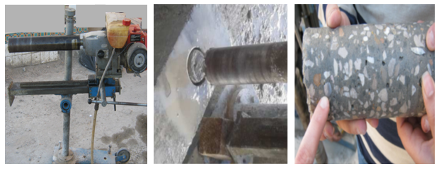 The hardened concrete cores were sampled according to standard NF EN 12504–114 using a core cutting machine (Figure 3). It is usually helpful to collect carrots not only in the most deteriorated areas but also in healthy areas. Comparative analysis of test results often helps to identify the causes of the damage. Core drilling should not affect the stability or structural strength of the structure. The positions of the reinforcements were detected before the coring using the profometer to avoid as much as possible to recover concrete specimens with reinforcements. The cores used to determine the compressive strength shall not contain any reinforcement parallel to their longitudinal axis. The diameter of core specimens for the determination of compressive strength in load bearing structural members shall be at least 3.94 mm. For non–load bearing structural members or when it is impossible to obtain cores with length–diameter ratio (L/D) greater than or equal to 1, core diameters less than 94 mm are not prohibited.