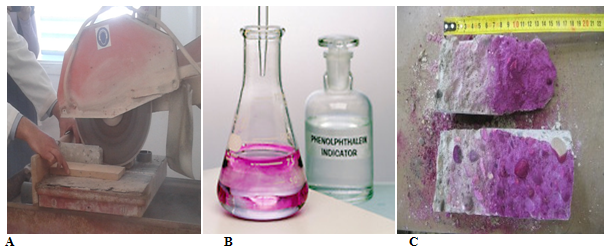 The measurement of the carbonation depth was determined by the phenolphthalein method according to BS EN 1463018 on the cores removed. Phenolphthalein is a colored pH indicator whose turn is around 9. Phenolphthalein turns non–carbonated concrete red, and remains colourless in carbonated concrete.