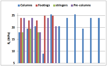 The Schmidt rebound hammer test was carried out on reinforced concrete elements such as pre–columns, columns, footings, beams and stringers. The Schmidt Rebound Hammer gives indications only on concrete on the surface and not at heart. Measurements made on old concrete can be so distorted if the concrete is carbonated. Indeed, a carbonated concrete on the surface increases the superficial compactness and therefore the compressive strength determined by the Schmidt Rebound Hammer test. Figure 7 gives the values of the compressive strength deduced from the Schmidt Rebound Hammer test carried out on reinforced concrete elements. It is noted that the compressive strength values (between 09 MPa and 25.5 MPa) are lower than the average value required for concrete dosed at 350 Kg/m3 at an age exceeding 28 days.