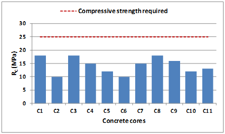 Figure 8 gives the values of the compressive strength of eleven concrete cores taken from the footings, pre–columns and columns. We note that compressive strength values vary between 8.10 MPa and 27.40 MPa. The density of the different cores has been also measured; it is between 2.15 t/m3 and 2.41 t/m3. The different cores have an average resistance of 17 MPa lower than the average value required for a concrete dosed at 350 Kg/m3 at an age exceeding 28 days.