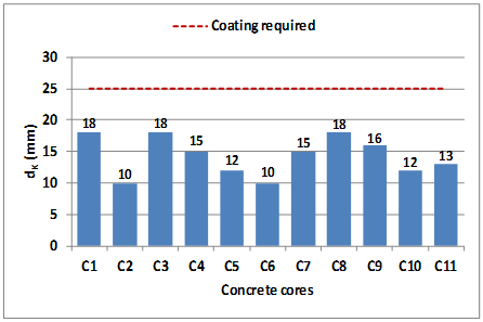 Carbonation is a source of degradation of reinforced concrete structures, which affects their durability. This phenomenon leads to the de passivation of the reinforcements and their oxidation. This is why it is necessary to evaluate the stage of aging of a concrete with a view to its repair knowing until, at a given moment, the carbonation has penetrated, that is to say the limit of protection still existing relative to the locations of the frames. Figure 9 gives the values of the carbonation depth measured on the cores taken from the footings, pre–columns and columns. We note that the average carbonation depth is equal to 14.27 mm which is less than the value of the coating (23 mm). These results confirm that the reinforcements are sheltered from the carbonation phenomenon.