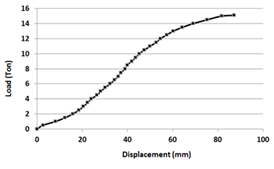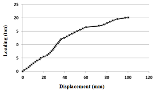 After preparation of sample according to results of compaction tests, the embankment was compacted in 5 layers of 10cm with optimum humidity of 6.82 percent per thirty times rolling passes. For experiments, firstly the degree of displacement gauge was set to zero and the load was incrementally applied by using the hydraulic cylinder. The loading processes continue until the embankment failed completely. It should be noted that the settlement of embankment crest and sub grade is recorded for each 500 kg. Figure 4 shows the load-displacement diagram for embankment without shred tires.