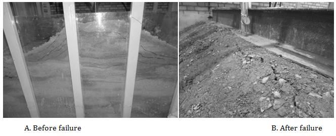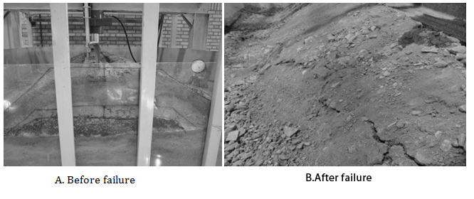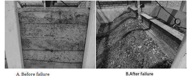 So in above equation, p is value of load in terms of ton and d is vertical displacement (settlement) in terms of mm. Figure 11 illustrates the form of embankment with core of shred tires before and after failure. Figure 11 Embankment mixed with core of shred tires