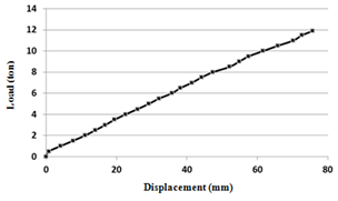 Comparing the outputs of the case (A) with the obtained results from three last conditions indicates an increase of shred tires with respect to the first case, and so choosing a suitable geometry is important. According to obtained results for four cores, load ratio obtained for cases of (B), (C) and (D) were 0.89, 0.91 and 0.92. It was concluded that the case (B) has the most shred tires and it bears a greater load, so it was chosen for test in the laboratory. In this test, the force was applied by jack to the beam and the crest of the embankment. During the test, the applied force increased with relatively constant speed. Steps of loading were 0.25 tons and they increased until the embankment failed. Finally, the embankment failed in load of 11.9 tons and settlement of 7.6 cm. Figure 10 shows the load – deformation for embankment with core of shred tires.