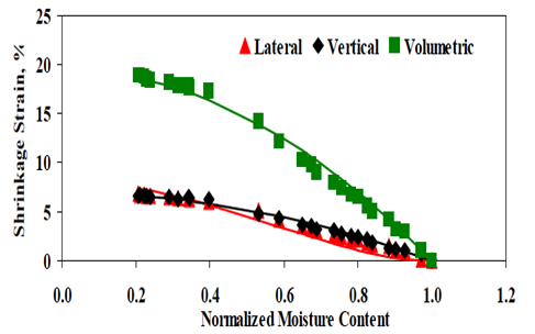 ) and moisture content seem well correlated. In Figure 1, a NMC of unity corresponds to OMC, and theoretically a NMC of zero corresponds to a completely dry soil. Shrinkage strains increase rapidly until NMC is decreased to 0.4 after which, it is almost constant. A number of mathematical relationships can describe the relationships between the three shrinkage strains (vertical, lateral and volumetric in Figure 1) and the NMC. Based on extensive curve fitting analysis the relationship shown below (Eq. 4) was selected with R2 value better than 0.95: