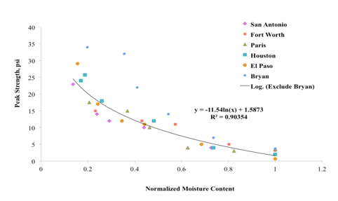 IDT tests were performed on two specimens of each clay type at six different moisture content levels from optimum to dry conditions. For moisture level beyond optimum towards saturation soil samples were too soft and IDT test was not performed. The variations in the average IDT strengths and normalized moisture contents for all soils are shown in Figure 5. All soils, except Bryan, follow a unique trend with approximately 25 psi peak strength under dry condition decrease smoothly to approximately 5 psi at OMC. Given the number of soil tested, and to build in conservatism in the model, the results from Bryan were excluded from curve-fitting process. The curve-fitted mathematical relationship to estimate