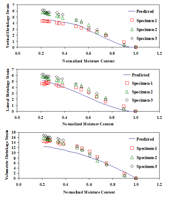 The clay material from Houston was not used in the development of the constitutive material models aforementioned in Equations (4) through (9), but rather used as validation. The composite parameters A* through G* are site specific which can be calculated as a function of soil index properties and best-fit R2 as explained earlier. Figure 6 compares the predicted and measured shrinkage strain with moisture variations for three Houston specimens. The results compared favorably with approximately 90%, 70% and 75% of the values within 20% margin of error for vertical, lateral and volumetric strains respectively. Different drying/wetting paths were studied. When soil specimens are dried through different path, the correlations between moisture content and soil mechanical property parameters (such as