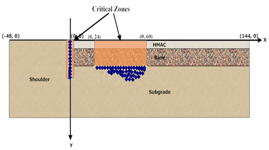 , MC is further reduced (subgrade continued to dry out). The simulation was repeated until the threshold was reached. The locations of the top fifty most critical stress points and critical MC thresholds are flagged. A typical low-volume HMA pavement section, consisting of a thin asphalt layer over base, sub base, lime-stabilized subgrade and natural subgrade was used. Each pavement layer was assumed to be homogenous, isotropic, and fully bonded to the underlying layer. Pavement shoulder was modeled as a uniform block fully bounded at the pavement interface. Because of symmetry, a half-wide pavement (12-ft wide) with shoulder (4-ft wide) was studied to reduce calculation efforts. As few as three layers and as many as five layers were introduced to the FEA program. Once the crack was onsite (