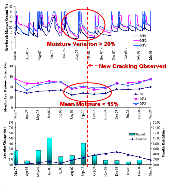 Based on a Texas Department of Transportation (TxDOT) district-wide survey1 the most prevailing Farm-to-Market (FM) HMA pavement distresses are: longitudinal cracking, followed by fatigue cracking, subgrade rutting, subgrade shear failure, excessive differential volumetric change and roughness. The response rate was 92% of all TxDOT districts. Among those responses, 78% reported highly variable properties of the expansive subgrade soil, as well as moisture fluctuations throughout the year were considered the main causes for above-mentioned distresses. Subgrade differential volume changes combined with large strength and stiffness variations make light structures such as HMA pavement sitting on top of the problematic subgrade soil highly susceptible to environmental variations despite of the overly conservative design widely recommended and used. The consensus among researchers and practitioners with considerable experience in the area of high-PI clay is to implement different preventative and remedial strategies to minimize subgrade moisture content (MC) variations. The need for an easy-to-use procedure to quantify critical MC thresholds for above-mentioned distresses led to the effort described in this manuscript. The MC approach was not only used to describe subgrade soil properties but also linked directly to pavement performance. Both the district survey and literature review shown the longitudinal cracking is the predominant mode of failure for flexible pavements, especially low-volume roads. Much effort has been made to study pavement longitudinal cracking, from cracking initiation and propagation mechanism to process simulation and prediction. This is due to the difficulties and high variabilities of measured shrinkage strain potentials and predicted shrinkage induced pressures. As pointed out by many researchers different drying/wetting paths of unsaturated soil has major effect on subgrade mechanical properties, especially problematic clayey subgrade. When soil specimens undergo different drying or wetting paths, the correlations between MC fluctuations and soil mechanical property parameters such as shrinkage stress (
