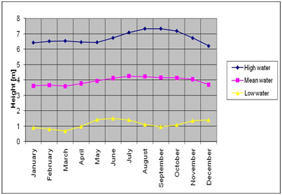 The water level of river Hugli near Falta is not maintaining same height throughout the year. For this reason a tidal variation chart has prepared with the help of Hugli River Tide Tables for Sagar, Gangra, Haldia, Diamond Harbour, Mayapur & Garden Reach (Kolkata)-2010, Published by Surveyor General of India.