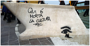 Its exquisite framework resembles a fish skeleton. The basic partition gilt is located on the bridge axis. The gilt is supported by leaning frameworks which resemble trusses without cross-braces. The supports of footpaths protrude from the partition gilt forming a horizontal frame. In the cross-section, the absolute transparency of the red steel structure combined with a transparent glass platform can bring to one’s mind an image of a butterfly (it. farfalla). The bridge meets all the requirements regarding the traffic gauge necessary for the movement of Venetian water buses (vaporetto). Will the bridge be accepted? Hard to say at the moment. (Figure 7) shows a protest, an artistic manifesto expressing the utmost doubt about Calatrava’s work. Moreover, the bridge has not been made available to the public entirely. Its glass landing and a plateau in the entrance have caused accidents, limb dislocations, which required medical interventions. Temporarily, at the entrances to the bridge signposts forbidding entry for people with locomotive disabilities have been put. Any inscriptions put on the bridge are immediately removed.