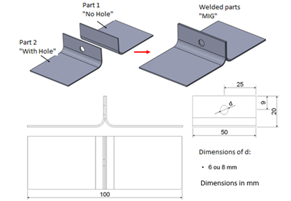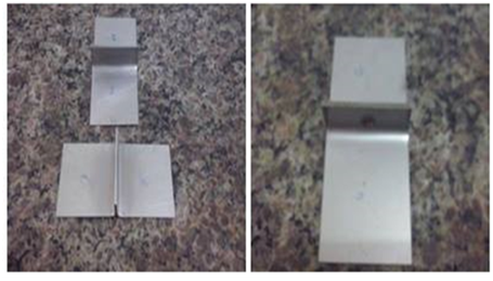 The carbon steel SAE 1020 specimens were fabricated 20 mm flap height and 50 mm width using plates of 1 mm thickness. In Figure 1 it is possible to observe the dimensions of the manufactured specimens. The electric arc welding process with gaseous protection atmosphere was used in this study to join the plates, using an inert gas to protect the fusion well. This process has been characterized in the market as MIG (metal inert gas). To analyze this process under the impact test, six specimens (Figure 1) were manufactured with a 6 mm hole diameter and 6 specimens with a 8 mm hole diameter to fill the weld, thus joining the plates. The parameters used were voltage 22 V, current 110 A, welding speed 240 cm/min, gas flow 12 L/min, arc time 20 s and 8 mm diameter wire. The spot welding process was carried out in this study using an electric resistance point welding machine, which has a suspended welding caliper with pneumatic cylinder from the manufacturer FASE model X/4 – 200. The electrodes used comply with Class 20 of RWMA standard. In this process, the diameter of the solder lens is a function of the welding current of 6 kA and 7 kA. The current time in this process is 20 cycles and the electrode strength is 1.8 kN. These parameters produced points with a diameter of 4 mm (approximately). Twelve specimens were manufactured through that process with the same dimensions shown in Figure 1 without the manufacture of a hole for joining the plates, six specimens at 6 kA and six specimens at 7 kA. In Figure 2A it is possible to observe a specimen manufactured by the RSW welding process and in Figure 2B a specimen manufactured by the MIG welding process.
