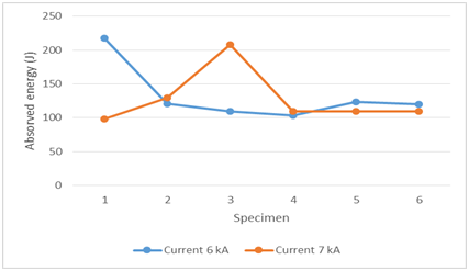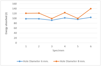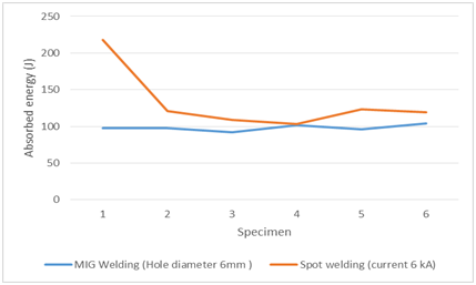In Figure 6 it can be seen the energy absorbed by the specimens with hole diameters of 6 mm and 8 mm welded by MIG during the impact test. It is observed from Figure 6 that all 8 mm hole diameter specimens absorbed greater energy than the 6 mm hole diameter specimens. On average, 6 mm hole diameter specimens absorbed 98.4 Joules, while 8 mm hole diameter specimens absorbed an average of 117.1 Joules. The Figure 7 shows the energy absorbed by the spot welded specimens under 6 kA and 7 kA current. It can be seen from Figure 7 that the specimen 1 (blue line) for welding at 6 kA and specimen 3 (orange line) for welding at 7 kA showed relatively higher energy absorption when compared to the others under the impact test. This was due to the electrode profile that was not sharp when the respective samples were welded. Thus, it is verified that the energy absorbed when the specimens are welded at 6 kA and 7 kA are similar, which means that these parameters did not influence the welding significantly. Therefore, only the specimens welded at 6 kA were considered to evaluate the energy absorbed in relation to the specimens welded trough MIG with hole diameter of 6 mm. From Figure 8 it is possible to observe the absorbed energy of welded specimens by means of electrical resistance spot welding (6 kA) and the MIG welding process (6 mm). Table 1 shows the statistical analysis using Student t–test as an analytical method, with a significance level of 0.05. The results showed that the mean energy absorbed between test specimens produced by the MIG welding process and the electrical resistance spot welding did not show significant differences. However, the average energy absorbed from specimens produced with the MIG process showed significant differences between specimens with 6 and 8 mm fill holes.